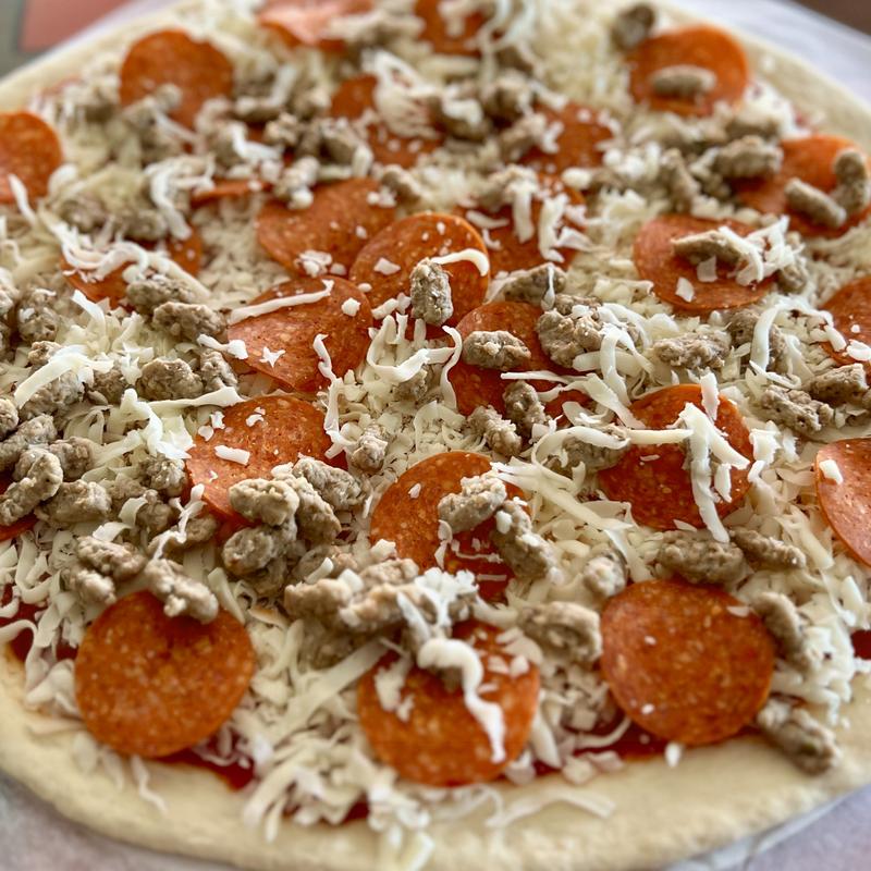• A carnivore classic with Canadian bacon, house- smoked pastrami, pepperoni, salami, and sausage on a marinara base