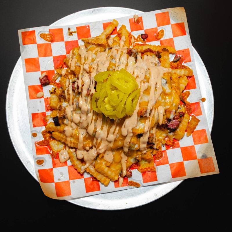 Fries loaded with our house-smoked pastrami, caramelized onions, melty cheese and topped with our housemade 1000 dressing and banana peppers