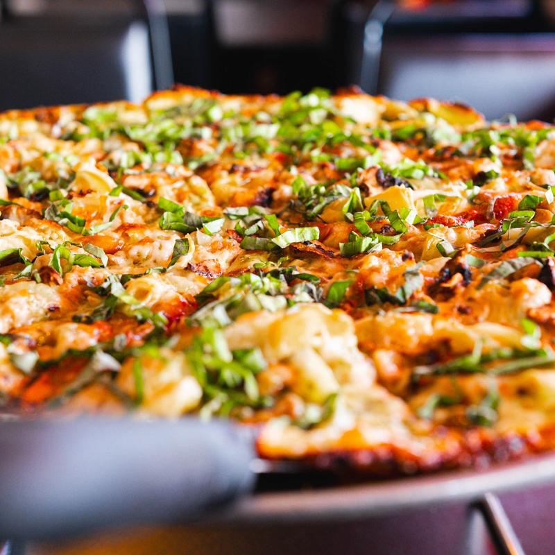 • Sausage, mushroom, onion, artichoke heart, garlic, and fresh basil on our signature pesto base