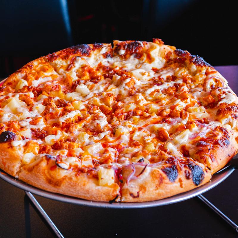 • Crispy chicken tossed in spicy honey, Canadian bacon, pepperoni and pineapple on a BBQ base. Drizzled with spicy honey and BBQ sauce