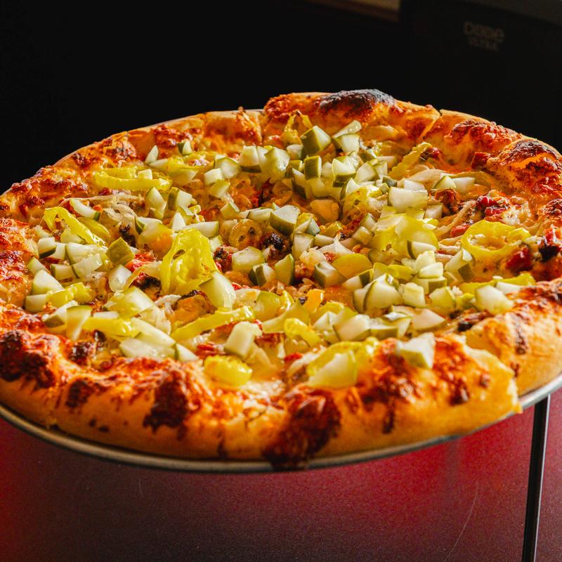 • House-Smoked Pastrami, banana peppers, sauerkraut, onion, and diced pickle on beer mustard base
