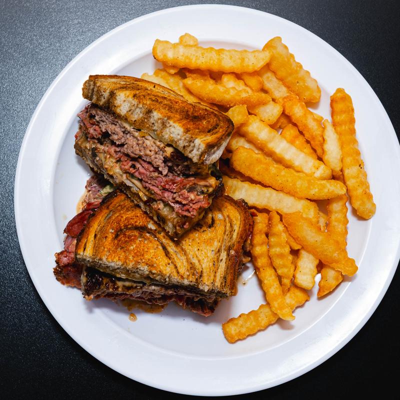 Hand-pressed patty, sliced pastrami, Swiss cheese, sauerkraut, and Thousand Island on toasted rye bread