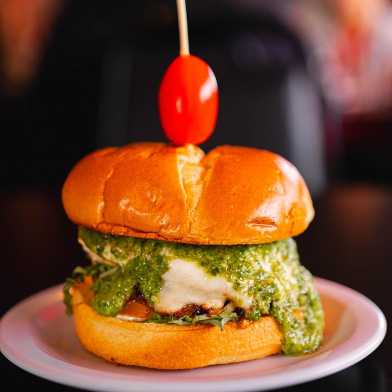 Grilled chicken breast, tomato, fresh mozzarella slices, red onion, basil, our signature pesto, mayo, and balsamic reduction on a brioche bun